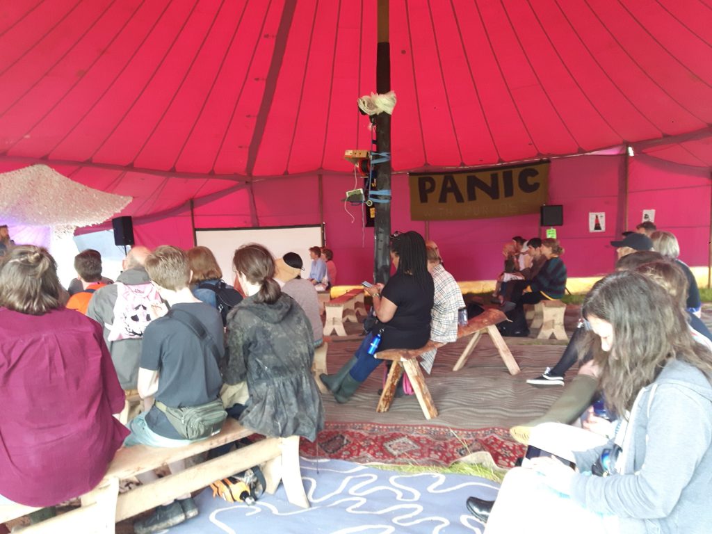 PANIC banner made onsite at Glastonbury for the Speaker’s Forum