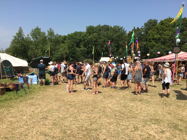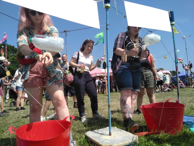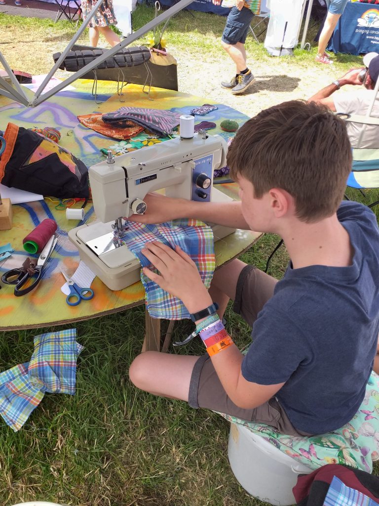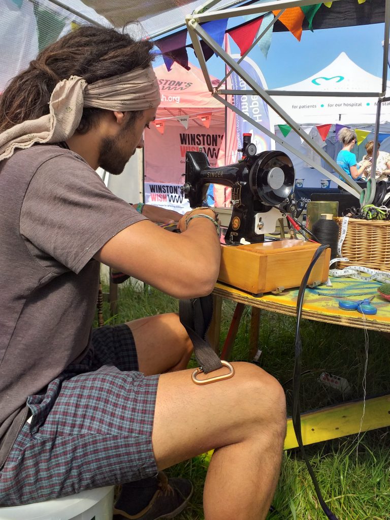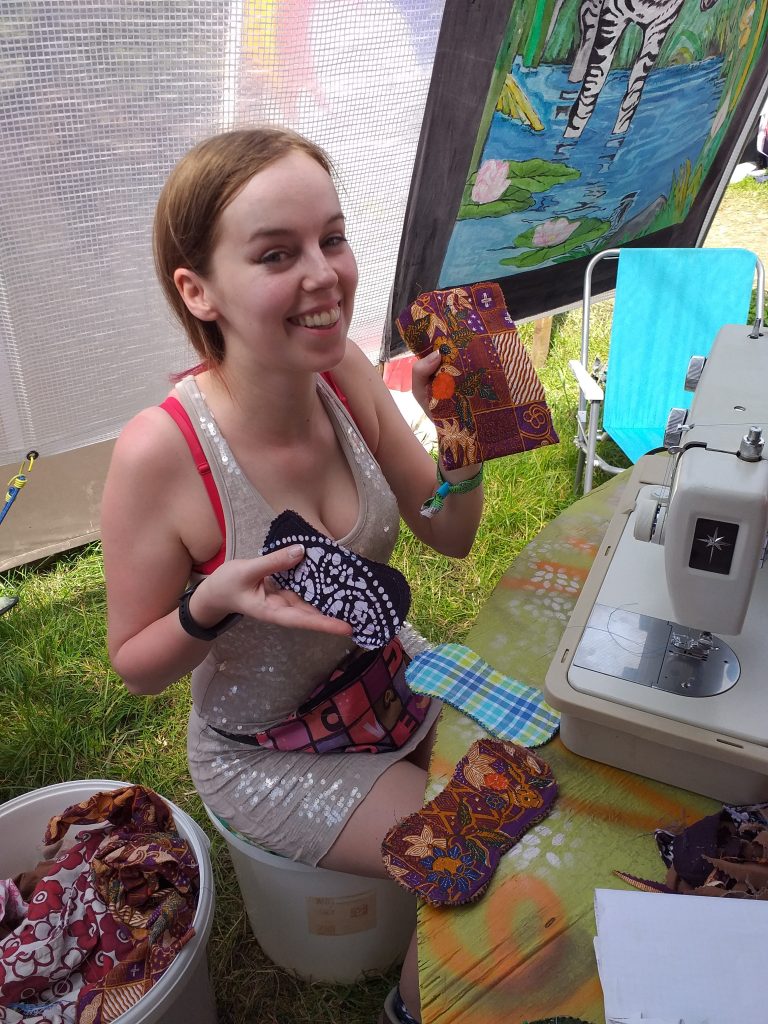 The 12V Solar Sewing project providing recycled fabrics and free use of three solar powered sewing machines proved just as popular at Glastonbury as it is at Green Gathering keeping the crew busy all day Wednesday to Sunday. The most popular items for passers by to make were washable sanitary pads and bags but the workshop was also put to good use by crew with mending to do and a bespoke banner was kindly produced for Glastonbury’s one and only debate space.